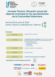 GEPACV, junto con la FVMP organiza una jornada técnica el viernes 28 de junio en el Centro Cultural de la Beneficencia de Valencia( calle Corona, 36) a las 10:30h. En ella, se presentarán los resultados del estudio sobre la situación actual del deporte municipal en los ayuntamientos de la Comunidad Valenciana, que elaboraron conjuntamente GEPACV y la FVMP.